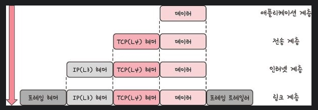 캡슐화: 데이터 송수신 시, 각 계층에서 계층들의 특징이 담긴 헤더들이 붙는 과정