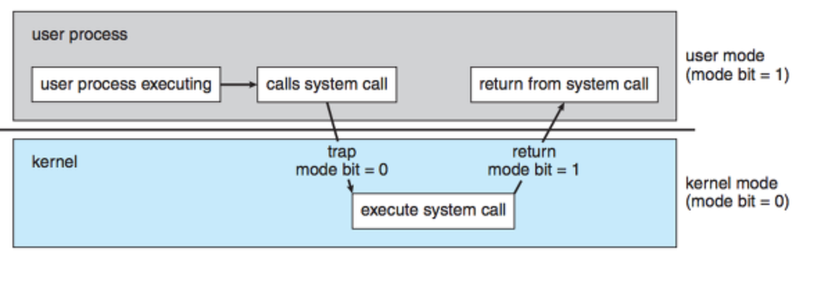 커널모드와 사용자 모드를 구분하기 위해 mode bit가 사용되며, 0이 커널모드 1이 사용자모드