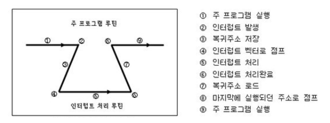 -> 인터럽트 서비스 루틴으로 점프, 처리 -> 주 프로그램 작업 복귀