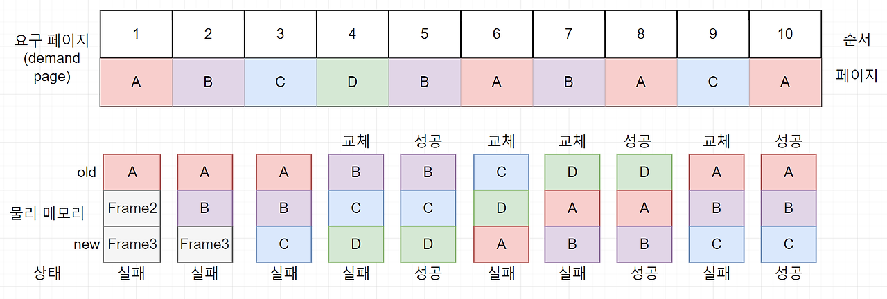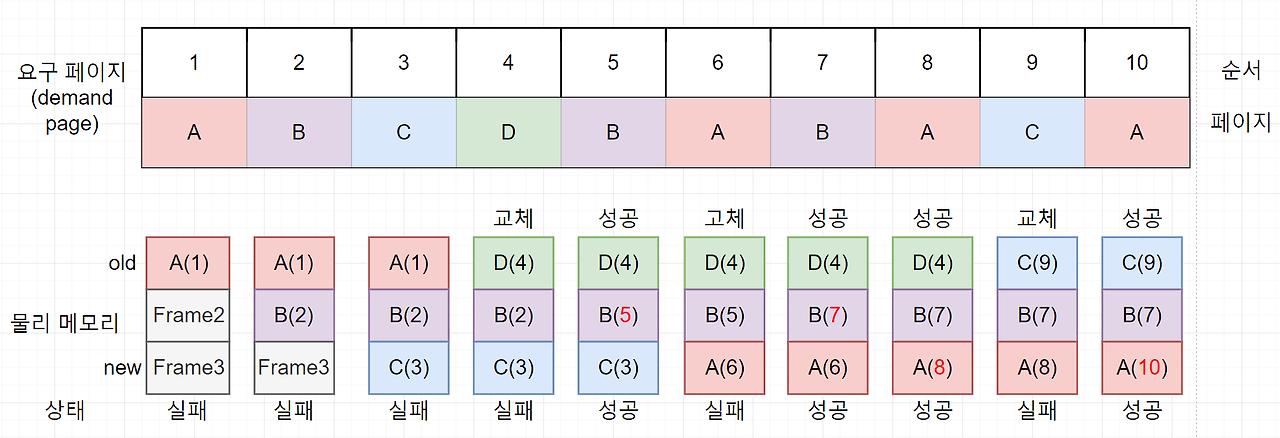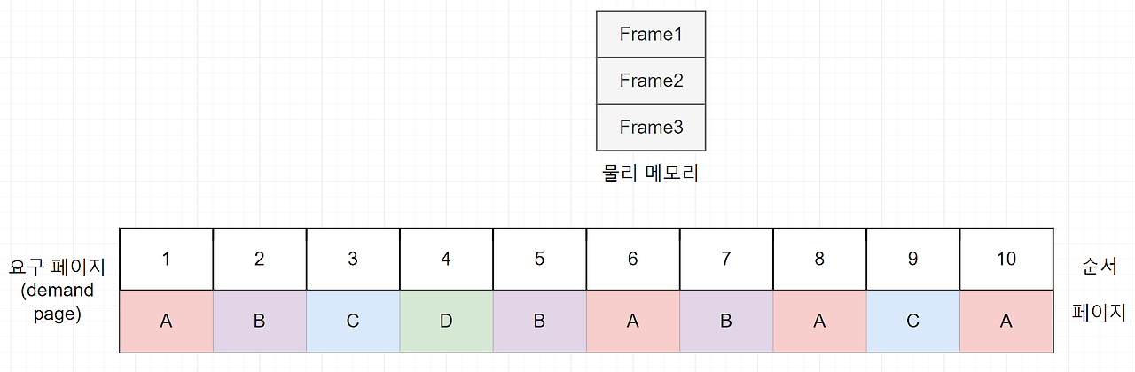 상단의 숫자는 메모리의 접근 순서이며, 페이지의 번호 대신 알파벳을 사용한다.