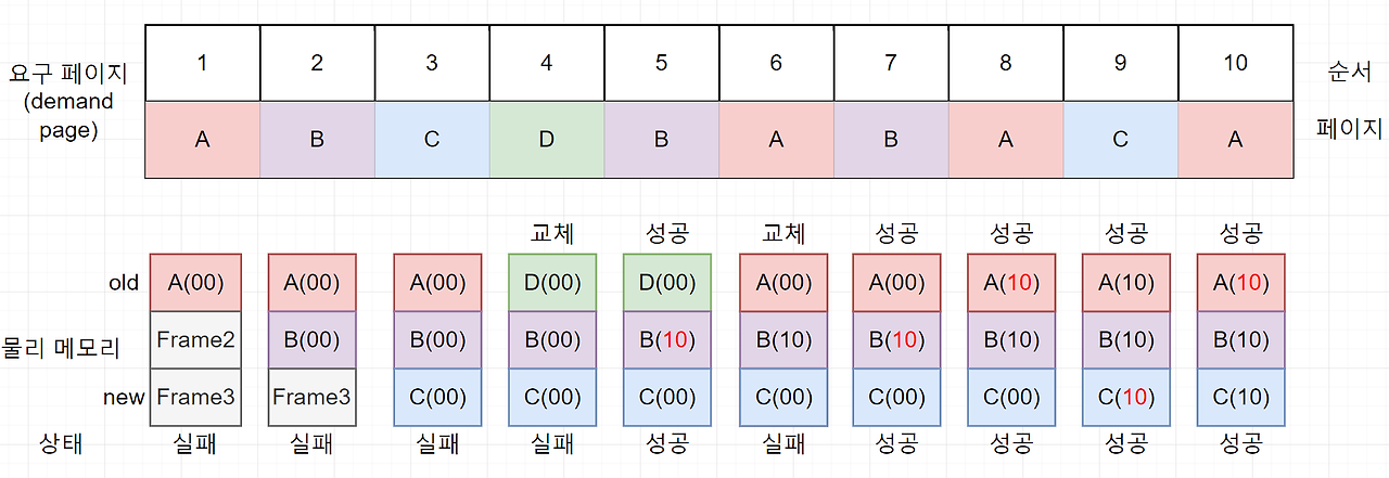 - 비트가 (0, 0) -> (0, 1) -> (1, 0) -> (1, 1)인 페이지 순서로 스왑 영역으로 옮긴다.