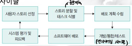 - 스프린트: 반복적 개발 주기(한 주기=한 스프린트)